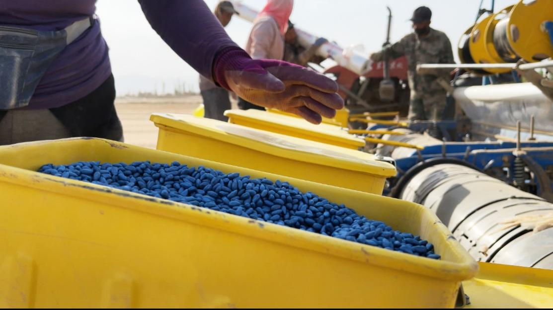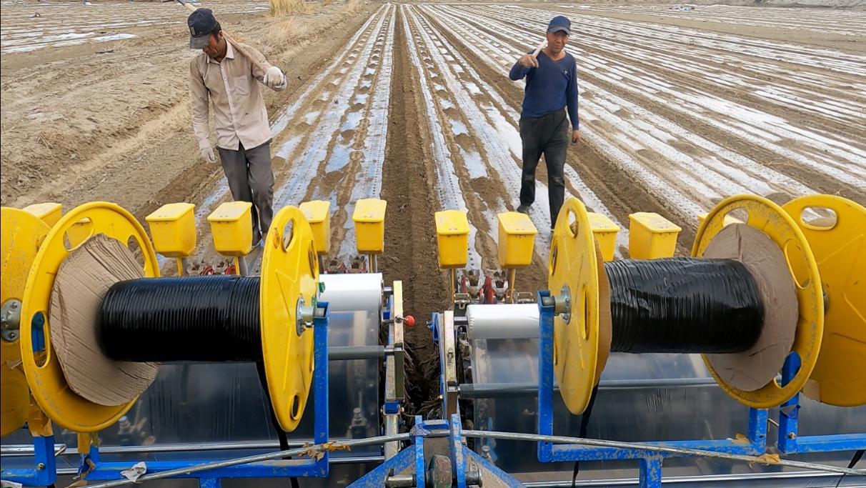 (棉农正在填装棉花种子,装设地膜、滴灌带)