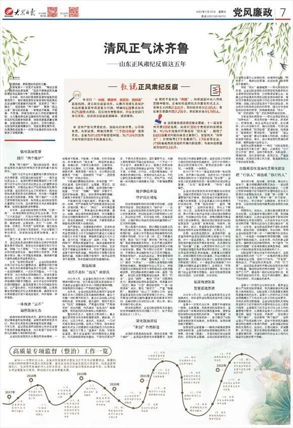 2022年5月29日,《大众日报》刊发“党风廉政”专版《清风正气沐齐鲁——山东正风肃纪反腐这五年》,全文如下。